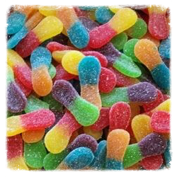 - Ingrédients : Sirop de glucose, sucre, eau, gélatine de boeuf Halal, amidon modifié de pomme de terre, acidifiants : E296, E330, E270, arômes, agent d'enrobage : cire de carnauba, colorants : E100, E129, E133.Sans Gluten.