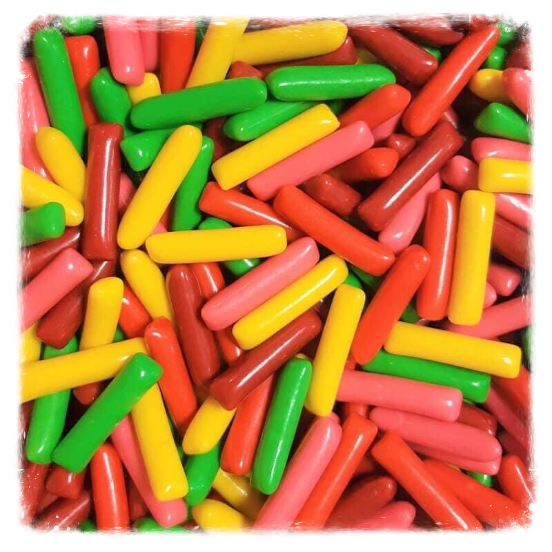 Sucre, sirop de glucose, dextrose, graisse de palme, 5% jus de fruits concentré (pomme, pêche, citron, fraise, framboise), gélatine (gélatine bovine), stabilisant: gomme arabique, amidon modifié, acidifiants: acide lactique, acide citrique, arômes, émulsifiant: lécithines, colorants: cochenille, curcumine, bleu brillant FCF, charbon végétal médicinal, agents d 'enrobage: cire de carnauba, shellac, cire d 'abeille blanche et jaune. Sans gluten.